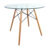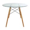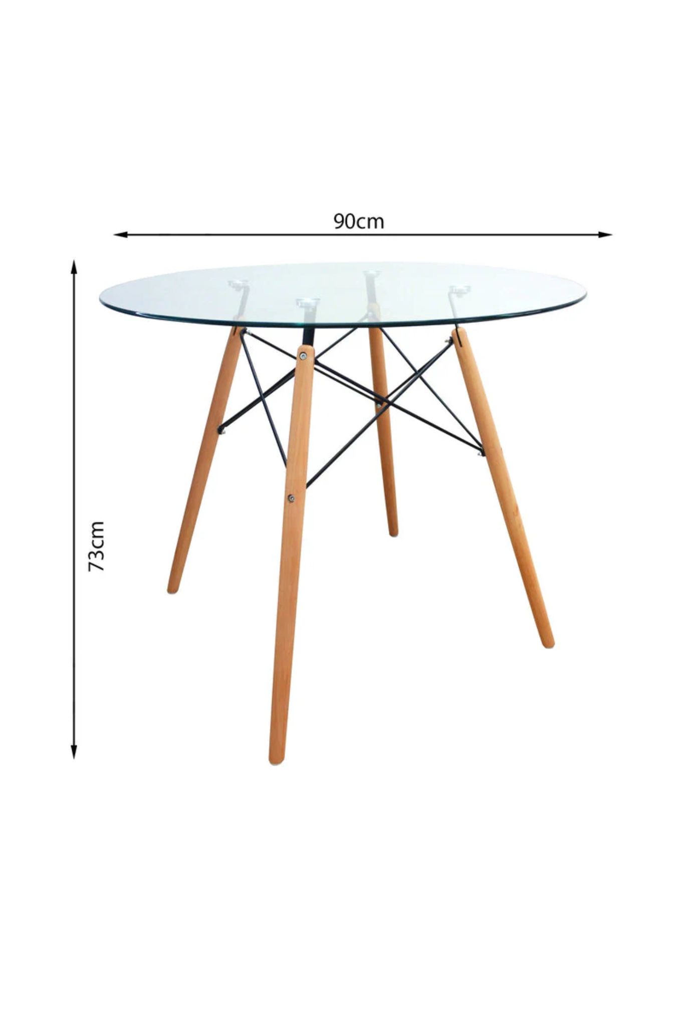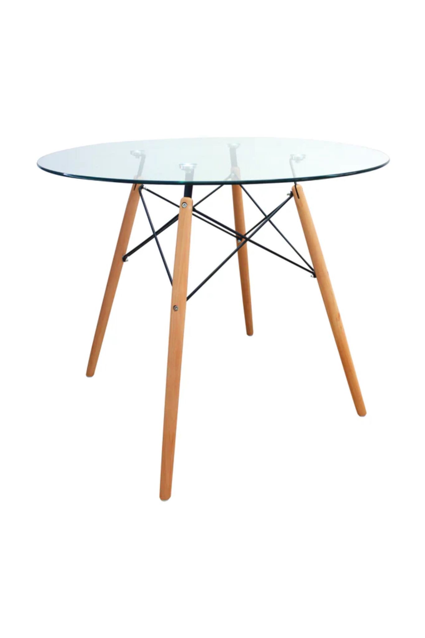 Este modelo equilibra la elegancia del cristal con la robustez de los materiales naturales. Su base está estructurada con patas hechas de madera de arce, conectadas mediante una base de metal resistente que evoca diseños clásicos del mobiliario industrial. La combinación de la madera clara con los tensores metálicos ofrece una estabilidad superior y un alto valor decorativo.