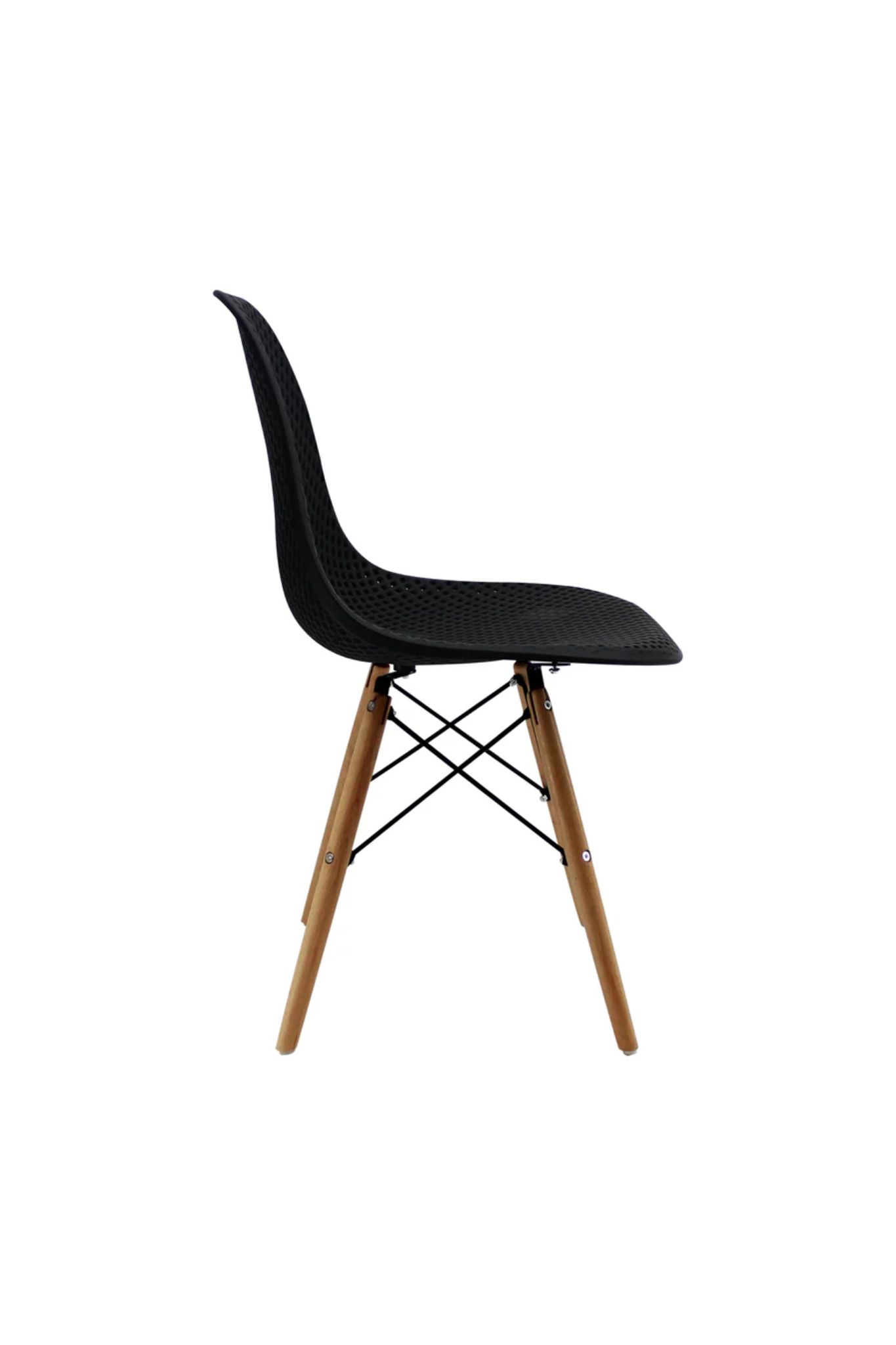 Este modelo redefine la silla de polímero mediante un asiento y espaldar fabricados en polipropileno inyectado de alta resistencia. Su diseño calado reduce el peso visual del mueble, permitiendo que se integre en comedores o áreas de trabajo sin recargar el ambiente.